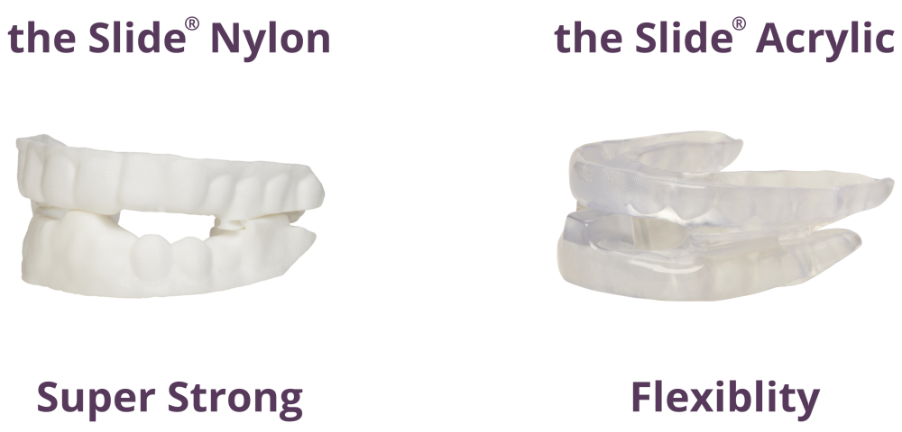 The Slide’s unique product line of soft-tissue friendly devices for sleep apnea and snoring is available in two versions made from different materials.